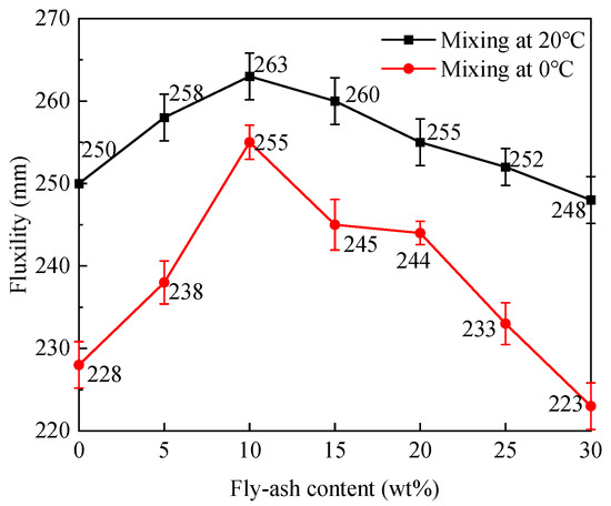 The influences of mixing temperature and fly ash content on the mixture fluidity of MPC repair mortar are shown in Figure 3. As can be seen from Figure 3 the fluidity of MPC repair mortar mixture both increases first and then decreases with the increasing of fly ash content at 20 °C and 0 °C, and it mixed at 0 °C is lower than that mixed at 20 °C, both of which reach the maximum when the content of fly ash is 10 wt%. This is because the spherical fly ash particles have a good “ball-bearing” effect in MPC mortar when the content of fly ash is lower. Figure 1 shows that fly ash is finer than MgO, and so, when the proportion of fly ash exceeds 10 wt%, the increase in the total surface area of raw materials will lead to an increase in water demand, a decrease in the free water volume in the mixture and in the fluidity. When the mixing temperature of MPC repair mortar is reduced from 20 °C to 0 °C, the decrease in solubility of soluble raw materials leads to the further increase in the surface area of solid particles to be wetted by water, and a slight reduction in the fluidity of the mixture.