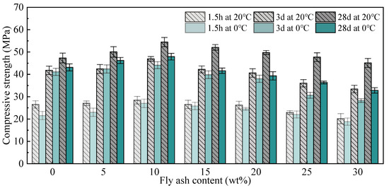The setting time effects of fly ash-modified MPC repair mortar cured at 20 °C, and 0 °C are shown in Figure 2. When fly ash-modified MPC repair mortar is mixed at 20 °C, the setting time gradually decreases with the increase in fly ash content. The initial setting time decreases from 13.9 min to 11.5 min when the content of fly ash is 30 wt%. This is because fly ash partially replaces NH4H2PO4 and MgO, which reduces the concentration of MgO and the retarder of the mixture, delays MgO dissolution and acid-base interaction, and, finally, shortens the setting time.