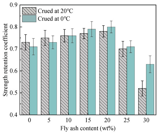 The influences of the temperature and fly ash content on the water resistance of MPC mortar paste are shown in Figure 6. When the fly ash content increases from 0 wt% to 20 wt%, the strength retention coefficient of the MPC repair mortar gradually increases. When the content is higher than 20 wt%, the strength retention coefficient gradually decreases with the increase in fly ash content.