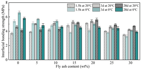 It can be seen from Figure 7 that the interfacial bonding strength of MPC repair mortar curing at 20 °C increases with the increasing of fly ash content, reaches the maximum at the content of 20 wt%, and decreases slightly when the content of fly ash continues to increase. The interfacial bonding strength of FA20 is up to 5.1 MPa, 5.4 Mpa, and 5.6 MPa, respectively, which is 37.8%, 17.4%, and 36.6% higher than that of FA0, respectively.
