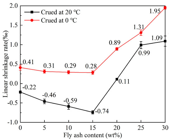 As shown in Figure 8, the linear shrinkage rate of MPC repair mortar curing at 20 °C decreases first and then increases with the increase in fly ash content and reduces to the minimum when the fly ash content is 15 wt%, which is −0.74‰. The linear shrinkage rate is negative when the fly ash content is no more than 15 wt%, which is to say, MPC repair mortar expands slightly during drying. This is because the active component Al2O3 in fly ash reacts with phosphate to form aluminum phosphate cementitious material, which fills between the pores and causes the expansion of the MPC repair mortar [15]. The linear shrinkage rate is only 0.11‰ when the content of fly ash is 20 wt%, and it increases rapidly when the content of fly ash continues to increase to 30 wt%, which indicates that MPC repair mortar occurs shrinkage during drying. However, when the fly ash content is too high, more MgO and NH4H2PO4 are replaced, and the amount of struvite is reduced [38]. Most of the water adsorbed on the surface of the fly ash particles does not participate in the hydration reaction, and it is more likely that it will be lost during the drying process, so the linear shrinkage rate increases.
