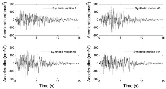 The randomness of seismic load is always quantified by a set of ground motions selected from an earthquake database or generated by stochastic ground motion models. However, it is difficult to select a suite of seismic records that can meet the requirement of the same local site conditions for stochastic analysis. As a consequence, stochastic seismic ground motion models are often used to generate a suite of artificial seismic ground motions, that can easily meet some requirements of site conditions, for the stochastic seismic analysis of various structural systems. In the present study, a random-function-based spectral representation method [34,41,42], combined with a design spectrum in Chinese seismic code, was used to generate 144 fully non-stationary synthetic motions for the stochastic seismic response analysis of the pile foundation in the present study. Using this method, the fully non-stationary stochastic ground motions can be modeled as follows:
