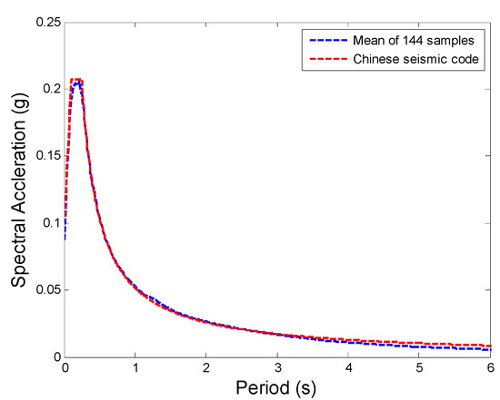 Comparison of the average response spectrum of 144 stochastic ground motions and the target standard response spectrum in the Chinese seismic code.