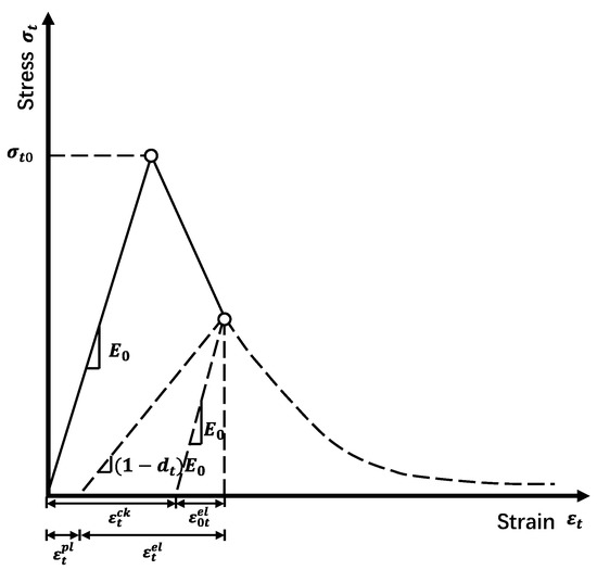 The stress–strain relationship of concrete under a tension condition is shown in Figure 4. When the stress exceeds the elastic limit stress σt0, it will enter the softening stage, and micro cracks will be formed in the concrete material, resulting in certain tensile damage. In the CDP model of concrete, the concrete tension damage characteristic can be characterized by the following stress–strain relationship: