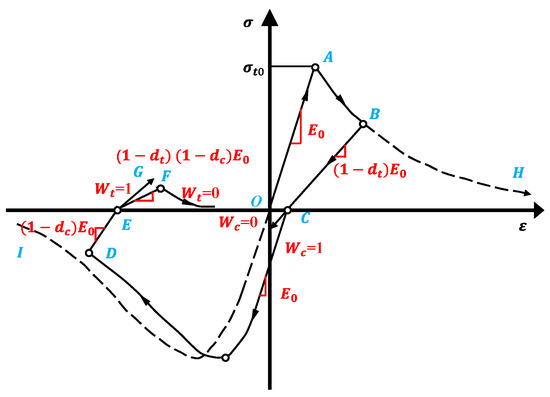 The stress–strain relationship of concrete under the compression condition considered in the present study is shown in Figure 5. When the stress exceeds the elastic limit stress σc0, it will enter the strengthening stage. Thereafter, the stress increases gradually until it exceeds the limit stress σcu, and it will enter the softening stage, and concrete compression damage will happen. The concrete compression damage characteristic can be characterized by the following stress–strain relationship: