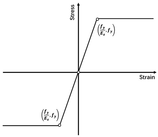 The behavior of the steel bars is characterized by the elastic perfectly plastic constitutive model, which is the same as the model in Conte et al. [25] and is shown in Figure 7. The main parameters of steel bars used in the numerical simulation are Young’s modulus Es = 210,000 MPa and yield strength fy = 471 Mpa. The tension and compression behavior of the steel bars is identical in this model. The steel bars are embedded into the concrete pile and are assumed to be perfectly bonded to the surrounding concrete.