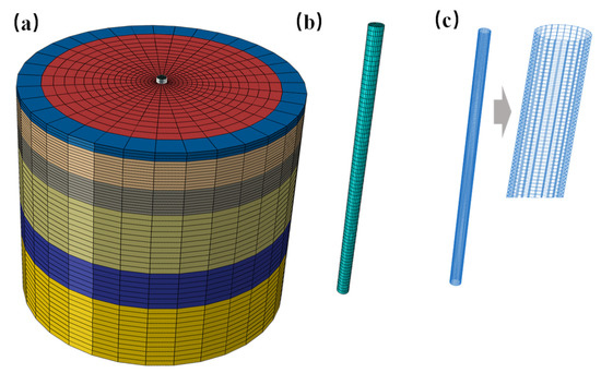 Finite element model of (a) soil foundation, (b) pile, and (c) reinforcement.
