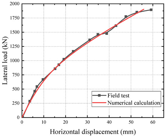 Comparison of the lateral load–displacement curve at the pile head from the field tests and from the numerical simulation.