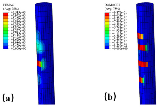 In Figure 10, the horizontal displacement of the pile mainly occurs at a depth of 0 to 10 m, which indicates that the influence of depth of the horizontal loads on the pile head is about 10 m (about 6.5D). Using a nonlinear constitutive model, the nonlinear and damage characteristics of the RC pile under the horizontal loads can be revealed. Figure 11 shows the distribution of plastic strain and concrete tension damage at the upper part of the pile body under 814 kN horizontal load. The plastic strain and concrete tension damage mainly occur at a depth of 2.4~6.9 m, indicating the development and distribution of the cracks in the upper portion of the pile under the horizontal loads.