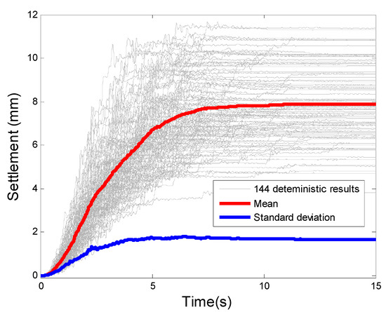 Figure 12 shows the mean value, the standard deviation, and the 144 deterministic results of seismic settlement time histories at the pile head under various stochastic ground motions. It can be seen from the figure that the seismic settlements at the pile head under various seismic ground motions show a similar trend. They increase gradually and then become basically stable at certain permanent values due to the nonlinear characteristics of soil and RC pile. Some maximum settlements of the pile reach about 11 mm under the stochastic ground motion excitation, while some maximum settlements of the pile are only about 3 mm, which demonstrates that the seismic responses of the RC pile under stochastic ground motions have great variability. Thus, it is necessary to resort to stochastic methods to quantify theses great uncertainties. The mean value and the standard deviation of the seismic settlements are also illustrated in Figure 12. They all increase with time because of the increase in accumulative settlement under earthquakes. The maximum mean value of the pile settlement is about 8 mm.