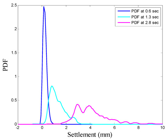 The PDEM has the ability to acquire instantaneous PDFs at different time points and reveal the propagation of uncertainty in nonlinear stochastic systems. The PDFs of the seismic settlements at three different time points (namely 0.6 s, 1.3 s, and 2.8 s) are illustrated in Figure 13. An unusual PDF shape can be observed in this figure, which demonstrates that using ordinary assumed distribution models (e.g., normal distribution, lognormal distribution, and extreme value distribution) to represent the seismic responses of the system for the dynamic reliability analysis of engineering structures is unreasonable and imprecise. The distribution ranges of PDFs at these three time points are enlarged with time, and it is because the accumulative settlement of the pile increases under earthquakes. The enlargement of the distribution ranges of the PDF also indicates that the variability of seismic settlements also increases with time, which is similar to the results observed in Figure 12. The propagation characteristic of the uncertainty in the nonlinear stochastic dynamic system of the RC pile is presented as the settlement PDF surface and the PDF contour in Figure 14. The settlement PDF surface is like a rolling hill and the high points denote the high probabilities of seismic response values. The settlement PDF contour is like flowing water, and it can be seen that the settlement distribution range also increases due to the increase in accumulative settlement under the seismic ground motions.