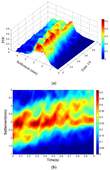 (a) Settlement PDF surface and (b) PDF contour at a time interval of 2~3 s at the RC pile head.