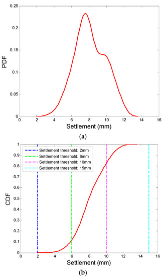 (a) Maximum settlement PDF and (b) maximum settlement CDF at the RC pile head.