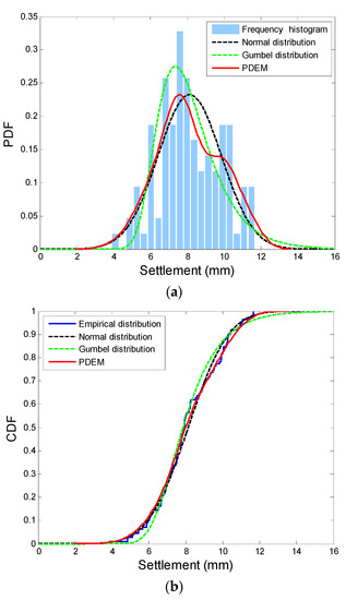 Comparison of the (a) maximum settlement PDF and (b) maximum settlement CDF at the RC pile head obtained using the PDEM and various distribution models.