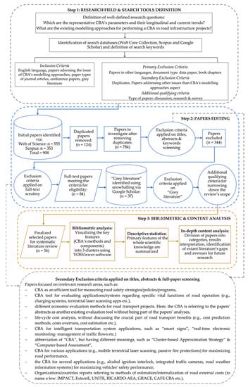 Primarily, for the holistic investigation of the current status of CBA’s method of RIPs to be guaranteed, the authors attempted to clarify the well-defined research questions of Figure 1 (step 1: “Research field and tools definition”). The peer-reviewed articles searching was performed by the Web of Science (WoS) Core Collection and Scopus bibliographic databases, which are two of the most widely accepted and well-recognized databases for high-quality bibliometric analysis (BA) [14]. The three-level structure of keywords and Boolean operators used for data mining among the fields of titles, abstracts and authors keywords into the WoS and Scopus are presented in Table A1 (in Appendix A). The scope was restricted to the English language, including the document types of journal articles and conference proceedings within a timespan between 2005–2020 because it was considered capable of capturing the dynamic evolution of the concepts that influence and develop the research topic’s evolution. The primary exclusion criteria of Figure 1 were applied to the search inside the bibliographic databases. Moreover, the authors practiced snowballing technique by complementarily extending their search into the references lists of the selected full-text papers for identifying non-peer-reviewed “grey literature”, namely government and multiorganizational reports. Grey literature was extracted via the Google Scholar (GS) web search engine.