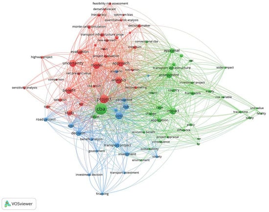 Three main research areas identified via VOSViewer map: (1) A comprehensive framework of individual parts of CBA approach (green cluster); (2) Approaches for incorporating uncertainty within conventional CBA (red cluster); (3) CBA as a decision tool within road project appraisal (blue cluster).