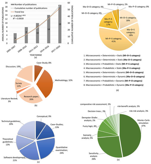 Subsequently, descriptive statistics of the 54 studied papers are presented to provide a preliminary overview of the relative literature (Figure 3); here the two literature review papers were excluded for focusing on methodological approaches. Initially, the used modelling approaches (deterministic, probabilistic, static, dynamic, microeconomic, macroeconomic) for performing CBA for RIPs were classified into eight categories (Mi-D-S, Ma-D-S, Mi-P-S, Ma-P-S, Mi-D-D, Ma-D-D, Mi-P-D, and Ma-P-D category; acronyms are fully explained in Figure 3d). Each category consists of a combination of three distinct modelling approaches, necessary for the CBA’s full performance since they investigate separate parts of the CBA procedures. It is worth mentioning that some modelling approaches are mutually exclusive according to the following categorization: