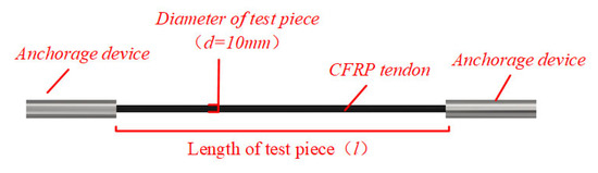 To avoid premature failure of the CFRP bundle in the test, the design length of the single-bending test specimen was set at 1500 mm, and the design length of the three times bending test specimens was set at 3000 mm by referring to the study of the intrinsic mechanical properties of the CFRP bundles under the combined tensile and bending by Fang et al. [36]. The ends of the specimens were anchored with a clip-type anchorage, as shown in Figure 1. The ends of the anchorages retained the internal threads and were used to connect the bearings and apply the tension-control forces.