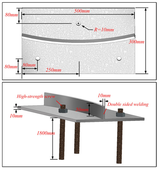 The single-bending test was intended to measure the friction loss caused by the sliding between the CFRP specimen and the deviator. Due to the material characteristics of poor shear resistance and not easy to bend, the CFRP specimen should be avoided to be subjected to excessive shear force in the test. The choice of circular deflector as the steering device of the single-bending test effectively avoids the damage of the CFRP specimen and explores the effect of different external conditions on the friction loss in a more intuitive way. The deviator was welded by an arc-shaped plate and a fixed, flat plate. The thickness of the arc-shaped plate was 10 mm. The friction coefficient of the contact surface between the deviator and the specimen was changed by applying lubricating oil (high-temperature molybdenum disulfide grease) and laying polytetrafluoroethylene (PTFE) plates. Three test conditions were set for the contact interface. From the test and evaluation of the bending tensile strength of CFRP bundles by Xia et al. [37] it is known that when the bending radius of CFRP bundles is above 1.5 m, the strength retention can reach more than 70%, which meets the test requirements. Due to the limitation of the test site, the bending angles of 20° and 30° were selected as the working conditions. The deviator was fixed in reinforced concrete by post-anchoring technology, with the specific dimensions shown in Figure 3.