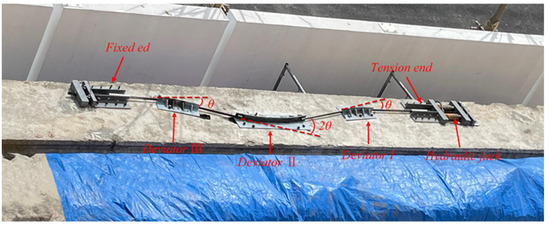 To measure the friction loss of the CFRP tendons under three-continuous-bending, as shown in Figure 5, the number of deviators was set to 3, which started from the tensioned end and were respectively denoted as deviator I, deviator II, and deviator III, and the straight-line distance between the endpoints of deviators was 0.3 m. Force sensor I and force sensor II were arranged on the supports on both sides to measure the tension control force, the prestress value, and the collection frequency was 5 Hz.