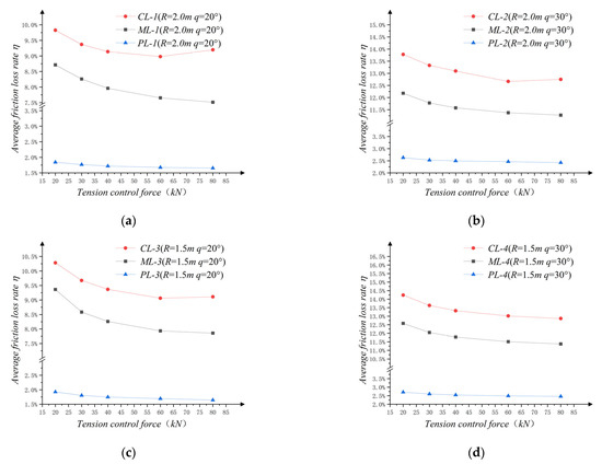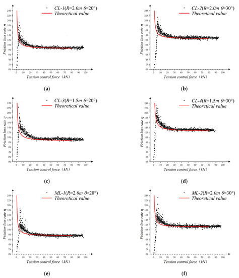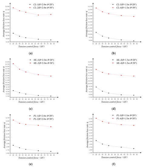In general, the friction loss rate decreased with an increase in the tension control force, Ft, and the change law approximated an inverse proportional function. When the friction interface was constant and the deviation angle was the same, the rate of the friction loss under the condition of the 1.5 m radius of the curvature of the deviator under the tensed control force at each level was greater than the friction loss rate under the condition of the 2.0 m radius of the curvature of the deviator. Thus, R was negatively correlated with friction loss rate. At the same time, under the different curvature radii, the decreasing rates of the friction loss were also slightly different.