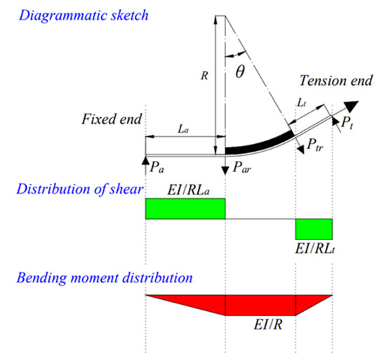 In the installation stage, the prestress of the tensioned end had not yet been applied, and the internal tension of the CFRP tendons was neglected. As shown in Figure 11, the internal tension can be divided into two parts according to the curvature of the test specimen: the curvature gradient segment, whose curvature changes uniformly along the length of the specimen, can be approximated as a straight-line segment for calculation, and the lengths are La and Lt respectively; the curvature fixed segment with constant curvature size, with size maintained at 1/R. According to the change in the external forces, Pa and Pt, applied on the specimen, the concentrated force was exerted by the support, which was perpendicular to the specimen, and the concentrated forces, Par and Ptr, applied by the deviator along the radial direction, respectively. The positions of action are at both ends of the deviator.