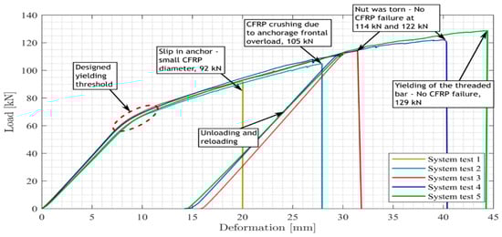 However, research has shown that there are various types of FRP debonding failures regardless the type of bonding material or bonding method used, including middle crack debonding, concrete cover separation, and plate end debonding. When FRP degumming fails, the effectiveness of the strengthening mechanism is greatly reduced [6,7,8]. A solution to this problem may be to combine effective installation procedures with well-defined and controlled prestressing of CFRP materials. An anchor system is one of the commonly used installation procedures and strengthening technologies in construction engineering, which has a wide range of applications in strengthening and reinforcing concrete structures, steel structures, and other components. When FRP debonding fails, this anchoring system may significantly improve the debonding process and interface bonding between FRP and RC concrete surfaces [9,10]. Schmidt studied a new type of prestressed CFRP NSMR reinforcement anchorage system, as shown in Figure 2 [11]. The purpose of Figure 2 is to show the approximate appearance of the anchoring system. The system has undergone five laboratory tests and has been successfully used in pilot projects to reinforce cast-in-place concrete bridges. The study focuses on considering the system’s responsiveness to ensure that it can provide consistent load/deformation curves, yield thresholds, and yield mechanisms. All reinforcement systems have undergone in situ anticounterfeiting loading after installation and prestressing procedures have been carried out as required to eliminate any possible failure modes below the anticounterfeiting loading level, as is shown in Figure 3. This study indicates that this new anchoring system has performed well in laboratory testing and pilot projects, and has great potential for application. The fatigue resistance of CFRP and GFRP materials is an important mechanical property. Engineering structures are often affected by cyclic loads, which can lead to material fatigue and adversely affect the service life and damage tolerance of components and connections. Alam detailed the effect of cyclic loading on the fatigue performance of carbon fiber composite materials [12]. This article argues that more targeted research is needed on how the manufacturing of CFRP, inherent material defects, crosslinking density (curing), and material uniformity will affect the dispersion degree of CFRP under cyclic loading. Wu verified their good fatigue resistance by studying the fatigue performance and macroscopic damage in CFRP bending anchor cables [13]. Under stress amplitudes of 500 and 600 MPa, the residual strength retention rates of CFRP rods after two million fatigue cycles are as high as 95.1% and 76.7%. The bending–anchoring CFRP anchor cable can withstand two million fatigue loads with a maximum stress of 0.4 σ Ult, with an amplitude of 500 MPa and without significant fatigue damage. Under more severe fatigue loading conditions, the macroscopic damage of CFRP bars mainly manifests as fiber splitting and compression shear fracture. The additional shear effect is a decisive factor affecting the fatigue resistance of CFRP rods. These research results contribute to optimizing the bending anchorage system, improving its fatigue resistance, and promoting the application and development of CFRP cables and bending anchorage systems in bridge structures.