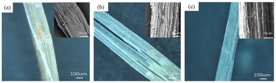 Micromorphology and structure of fibers with different treatments (a) H, (b) HP, and (c) HPM (adapted from [15]).