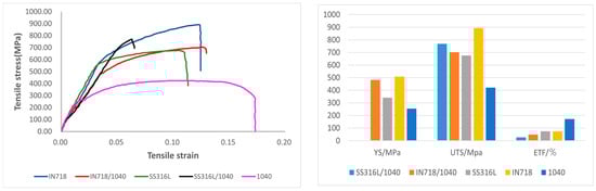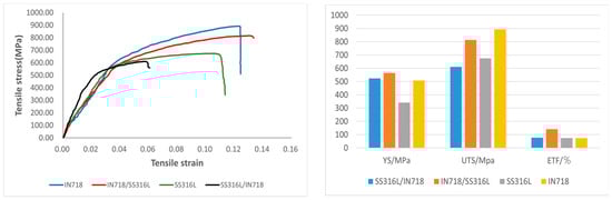 Laminated composite materials are composite materials composed of two or more layers of different materials combined in a specific way, with good mechanical properties and various application fields. In order to further improve the strength and resilience of laminated composite materials, various new methods have been proposed, for example, changing the deposition sequence, adding synthetic fibers, interlayer reinforcement technology, design optimization, explosion-proof welding methods, etc. The deposition sequence and deposition materials are important factors affecting laminated composite materials. In recent years, many researchers have conducted experiments on material manufacturing and deposition sequence. Yang et al. studied 316L stainless steel in laminated composite materials and compared four laser scanning strategies. By using subtraction milling technology, they obtained a smooth surface and analyzed the average density, defects, average hardness, and tensile properties of the material. In addition, due to the clear interface of laminated composite materials, they also studied the possible residual stress, tensile anisotropy surface roughness, and internal defects that may exist during the manufacturing process of laminated composite materials through addition and subtraction hybrid manufacturing (HASM) [31,32,33,34,35,36]. Bhaburi et al. estimated the surface/interface quality, microstructure, and mechanical properties of hybrid aluminum parts, and improved their microhardness and joint strength through heat treatment [37]. In the field of laminated composite materials, SS316L and Inconel 718 alloy laminated composite materials are manufactured through mixed additives and subtraction to obtain materials with good mechanical and high-temperature properties. In addition, by studying the microstructure near the interface and the tensile properties in the deposition direction, it is possible to further understand the performance and feasibility of laminated composite materials. Li used HASM technology to manufacture laminated composite materials in one step and provides customized performance [38]. The improved additive manufacturing system and auxiliary traction milling can maintain a smooth and clear interface for energy deposition, solving the challenge of connecting different materials. The experimental results indicate that laminated composite materials with different deposition sequences have different microstructures and mechanical properties, among which IN718 laminated composite material deposited on SS316L exhibits the best performance, while new substances are generated at the interface between SS316L and 1040 steel to improve performance, as shown in Figure 7 and Figure 8.