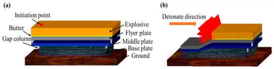 Schematic diagram showing the EXW experiment: (a) welding process design; (b) welding process at some point (adapted from [47]).
