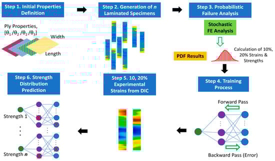 At present, models and software simulations have been widely established and applied toward laminated composite materials. Among them, finite element analysis and the genetic algorithm are the most commonly used methods, which can simulate the mechanical behavior of composite materials. In addition, multiscale simulation methods based on microstructure are gradually receiving attention, which can more realistically reflect the microstructure and mechanical properties of composite materials. Coelho described a computational model for designing bimaterial composite laminates using a multiscale topology optimization model to optimize the design of structures and materials [48]. The model is based on a hierarchical optimization strategy, taking into account the manufacturing process and basic characteristics, and using a mixed set of micro- and macrodesign variables to characterize the distribution of the two materials. This method has yielded better design results, which helps to provide a deeper understanding of the effectiveness of the microstructure characteristics of composite laminates. Shi employed the LS-DYNA software to simulate the dynamic and progressive failure process in laminated composite materials [49]. This simulation utilized the MAT_162 material models, encompassing factors such as strain rate, damage evolution, and anisotropy effects. To determine the model parameters, traditional standard and nonstandard testing methods were used, including double shear and Brazilian testing. Through experiments and numerical simulation, the fidelity of the developed material model parameters was verified, including the modulus and strength in plane and full thickness directions, fiber matrix splitting and shear fracture, and other failure modes. Nastos introduced a strength prediction method for composite laminates based on a combination of numerical and nondestructive testing, aiming to predict strength through nondestructive testing, as shown in Figure 10 [50]. In order to manage the difference between the maximum load of 20% and 100% in the sample, a high-fidelity physics-based numerical model, deep learning technology, and noncatastrophic experiments were used. This application is trained using convolutional neural networks and Monte Carlo dropout techniques, and validated using probabilistic failure analysis datasets generated by stochastic finite element methods.