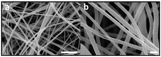 SEM images of electrospun PVDF/BaTi nanocomposite fibers: ES-PVDF (a,b). (adapted from [60]).
