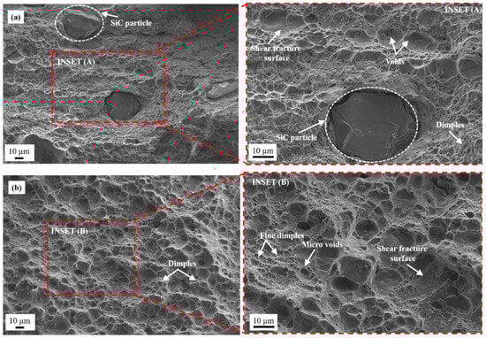 Fractography images of (a) SiC-particle reinforced and (b) Zn-particle reinforced tensile failure specimens (adapted from [78]).