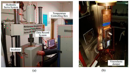 Viscoelastic materials have characteristics such as elastic behavior, noninstantaneous deformation, and viscosity, making them the main materials for manufacturing viscoelastic dampers. Xu developed viscoelastic materials based on different matrix rubbers and conducted experiments [96]. The results indicate that the viscoelastic damper based on a nitrile rubber matrix has high energy dissipation capacity, while the viscoelastic damper based on a silicone rubber matrix has stable performance under different working conditions. To elucidate its mechanical properties, an equivalent high-order fractional derivative model considering temperature and frequency effects was proposed, and numerical results consistent with experimental results were obtained. Xu introduced the application of viscoelastic dampers in seismic reduction [97]. Firstly, the mathematical model of VE dampers and the dynamic analysis of structures with VE dampers were introduced. Then, an equivalent standard solid model is used to describe the effect of temperature on the energy absorption characteristics of VE dampers. Finally, the response of a three-story reinforced-concrete frame structure with and without VE dampers was studied through elastic–plastic time field analysis, frequency field analysis, and shaking table tests. The results showed that VE dampers can be modeled using an equivalent standard solid model, and are effective in reducing structural seismic response. Xu introduced the preparation and performance testing of acrylic viscoelastic dampers [98]. On the basis of acrylic rubber molecules, the optimal formulation of viscoelastic dampers was prepared and mechanical properties were tested. The performance of the damper under different temperatures, excitation frequencies, and displacement amplitudes was studied, and it was found that it has good damping performance and is influenced by environmental temperature and excitation frequency, while the energy dissipation capacity of a single circuit is significantly affected by displacement amplitudes. In order to accurately represent these effects, a modified fractional derivative equivalent model was introduced and compared with experimental data to verify the correctness of the mathematical model. Xu proposed a high order fractional derivative model and temperature frequency equivalence principle to characterize the effects of frequency and temperature, and introduced internal variable theory to consider the effect of internal/microscale structure evolution on capture displacement [99]. The mechanical properties of a plate shear-type viscoelastic damper under sinusoidal displacement excitation at room temperature have been tested, as shown in Figure 15, and it has been proved that the high-order fractional derivative model modified using the internal variable theory and the temperature frequency (0.1–25 Hz) equivalence principle (ITHF) is sufficiently accurate in describing the dynamic behavior of viscoelastic dampers with different frequencies and displacement amplitudes.