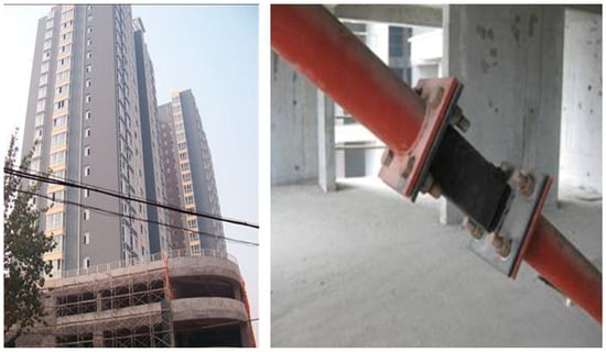 Xu introduced the common applications of viscoelastic dampers as passive control devices for structural vibration reduction, and mentioned that their energy dissipation characteristics are influenced by temperature and frequency [100]. To describe the complex characteristics of this damper, a new model, the equivalent standard solid model, was proposed and applied to the comparison of experimental and numerical data. At the same time, the author applied 52 viscoelastic dampers to the seismic reinforcement design of Xi’an Petroleum Hotel, and conducted finite element analysis on the structures with and without dampers. The results indicate that viscoelastic dampers can effectively reduce seismic response and are a high-performance energy dissipation device, as shown in Figure 16.