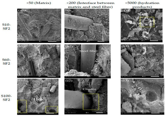 SEM images of AASSC with different substitution ratios of silicomanganese slag: (a1–a3) S10-SF2 (b1–b3) S60-SF2 (c1–c3) S100-SF2 (adapted from [108]).