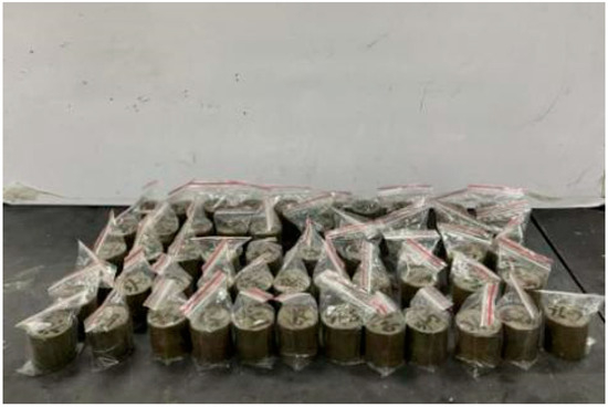 The UCS was used as the measure for the dry–wet cycle test [3]. The specimen preparation method was the same as that for UCS. The specimens were air-dried for 1 day and then soaked in water for 1 day to complete a dry–wet cycle (shown in Figure 4). After each cycle, the UCS was measured using a pavement strength tester at a speed of 1 mm/min.