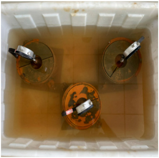 According to JTG 3430-2020, the CBR test was conducted using specimens of Φ152 mm and H170 mm. The production of the specimen is similar to that of UCS. According to the OWC and the MDD and the different compaction degrees, the test materials were weighed and loaded into the test mold, and the specimens were formed by the single static pressure method [31]. After soaking in water for 4 days (shown in Figure 3), the CBR value of the specimens was measured at the speed of 1 mm/min.
