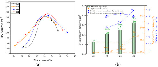 SR is easy to compact; their compaction curves are shown in Figure 5a. Taking the G1 without any external additives as the control group, the effects of cement and lime on the MDD and OWC of SRS are analyzed. The percentage increase of the MDD and OWC of the external additive groups (G2, G3, G4) compared with the G1 is defined as the contribution rate of the external additives. Here, the percentage increase of the MDD and OWC when the external additive is 1% as the unit contribution rate, as shown in Figure 5b.