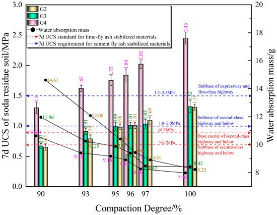 The UCS values of the G2, G3, and G4 are shown in Figure 6. The G2, G3, and G4 have different 7d UCS values in different compaction degrees. According to JTG/T F20-2015 [35] (Technical Guidelines for Construction of Highway Roadbases) and the strength requirements of different structural layers under different traffic levels of the highway, suitable mix proportions can be selected. The UCS of the G2, G3, and G4 increases continuously with the increase of compaction degree. With the compaction degree increasing from 90% to 100%, the UCS of G2, G3, and G4 increases by 102%, 97%, and 88%, respectively. The UCS of the G4 is the highest, significantly higher than that of the G2 and G3 by 80–140%. The UCS of the G2 and G3 are basically the same at different compaction degrees, indicating that adding 6% cement and 8% lime to the SRS has similar effects on the UCS.