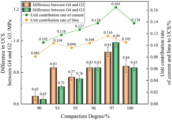 The difference between G4 and G2 is taken as the contribution of lime to the improvement of UCS, and the difference between G4 and G3 is taken as the contribution of cement to the improvement of UCS. The contribution rate per unit of external addition of 1% cement or lime is calculated as the unit contribution rate of cement and lime to UCS, respectively (shown in Figure 7). It is found that the unit contribution rate of cement is significantly higher than that of lime. Compared to lime, the gelling property of cement is stronger, and the hydration between cement and water is more intense, resulting in the generation of more hydration to fill and wrap the SRS.