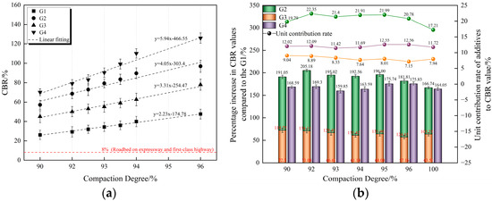 The CBR values of each proportion are shown in Figure 8a. All four proportions’ CBR values meet the minimum CBR value requirement (8%) for subgrade on expressways and first-class highways in JTG D50-2017 [36] (Specifications for Design of Highway Asphalt Pavement). The minimum value of G1 is 39.92% at 96% compaction degree, which is nearly five times higher than the requirement specified in the regulation. Among the different compaction degrees, the CBR value of G4 is greater than that of G2, G3, and G1. The CBR values of each proportion increase with the increase in compaction degree, and there is a significant linear relationship between them, shown in Equation (1).