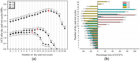 As shown in Figure 10a, the UCS of all three proportions (G2, G3, G4) presents a trend of first rising and then falling, and there is a critical number (the number of inflection points of UCS rising and falling). The strength loss percentage (SLP) is used to express the strength loss of each proportion after the wet–dry cycles, followed in Equation (4).