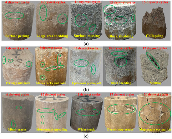 Figure 11. Apparent deterioration development after different dry–wet cycles: (a) Specimens of G2 for 4, 8, 11, 13, and 15 dry–wet cycles; (b) Specimens of G3 for 4, 9, 12, 15, and 17 dry–wet cycles; (c) Specimens of G4 for 6, 12, 15, 17, and 20 dry–wet cycles.