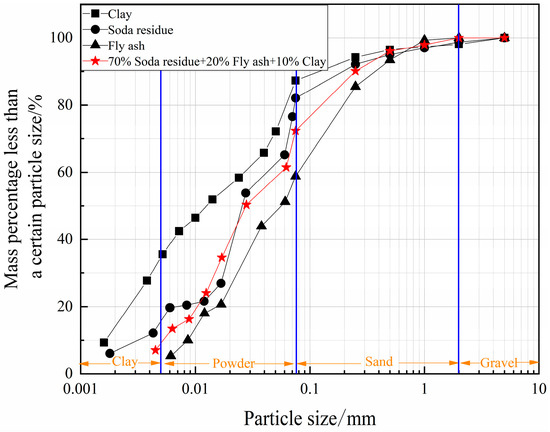 Test materials and particle size analysis are presented in Table 4, and particle size distribution is shown in Figure 12. The predominant fraction in the SR is powder particles (67%), while the clay contains mainly powder particles (53%) and clay particles (34%). The FA consists mostly of sand particles (40.3%) and powder particles (59%).