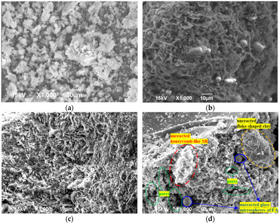 The micromorphology of test materials and various proportions is shown in Figure 13. The SR has a honeycomb-like structure, which is flocculent and relatively loose; the pores of different sizes are distributed between the flocculence (Figure 13a). The FA possesses a sponge-like surface on which glass microspheres are not uniformly distributed (Figure 13b). The clay appears as flake-shaped particles, which are assembled in a face-to-face overlapping manner (Figure 13c).