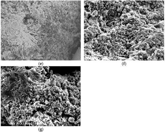 Figure 13. Microstructure: (a) SR microstructure; (b) FA microstructure; (c) clay microstructure; (d) G1 microstructure; (e) G2 microstructure; (f) G3 microstructure; (g) G4 microstructure.