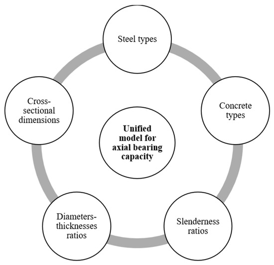 To solve the above research gap, based on the Hoek–Brown failure criterion, a unified model for the axial bearing capacity of CFST columns is established, which can be used to calculate CFST columns with a slenderness ratio of 1.78–30, diameter–thickness ratio of 13–202, steel tube yield strength of 186 MPa–1233 MPa, concrete cube compressive strength of 25 MPa–125 MPa, and concrete cylinder compressive strength of 20 MPa–193.3 MPa, as shown in Figure 2. At the same time, the proposed model can also be suitable for different types of concrete columns (including ordinary concrete, recycled concrete, HSC, and rubber concrete) and steel tubular (including ordinary steel, stainless steel, and HSC). The unified model can predict the axial bearing capacity of almost all CFST columns under axial compression because the parameters in the data established in this paper range widely. In this paper, two databases were established to determine the conversion formula between cube and cylinder compressive strength and the axial bearing capacity model for CFST circular columns. Secondly, the advantages and disadvantages of existing axial bearing capacity models were analyzed. Then, according to the Hoek–Brown failure criterion, the ultimate compressive strength of core concrete was established. Then, the axial bearing capacity model for CFST short columns was established by the existing test data. Based on the axial bearing capacity model for CFST short columns, the axial bearing capacity model for CFST long columns was established considering the slenderness ratio. Finally, to verify the accuracy and application of the proposed model, the axial bearing capacity of CFST columns under high temperatures was predicted by using the proposed model, and the results show that the model is accurate and reliable.