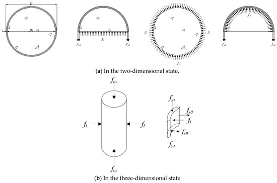 Therefore, two theories, including superposition theory and limit equilibrium theory, were used to establish a unified theoretical model for axial bearing capacity in this paper, as shown in Equation (1). Therefore, some reasonable assumptions need to be made: (1) the steel tubular may not necessarily reach fys [21,37,55,57] when the CFST column reaches the limit state; (2) it can be used to solve the ultimate compressive strength by three-dimensional confinement pressure failure criterion [57].
