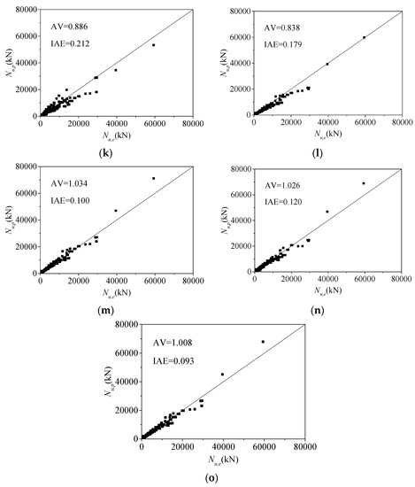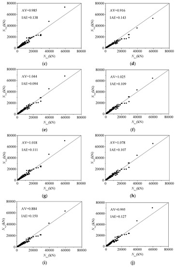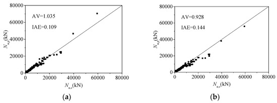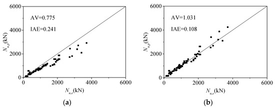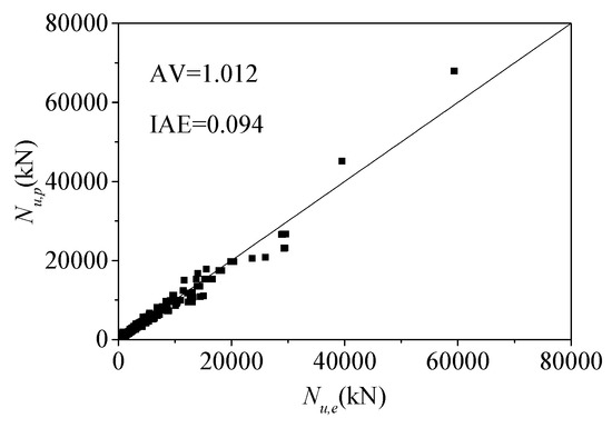 At the same time, to prove the universality of the proposed model, the proposed model also was used to evaluate the axial bearing capacity of CFST columns under high temperatures to reflect the accuracy of the proposed model, as shown in Figure 9. The experimental data come from a published reference [72], with 10 specimens in total, which discusses an experimental study of the residual axial bearing capacity of high-strength CFST short columns under axial compression after fire. As shown in Figure 9, the model proposed in this paper also has high accuracy in predicting the axial bearing capacity of CFST columns under high temperatures, and AV and IAE are 1.007 and 0.100. On the other hand, it also shows that the confinement mechanism established in this paper is correct. In other words, it is accurate to use the Hoek–Brown failure criterion to calculate ultimate compressive strength.